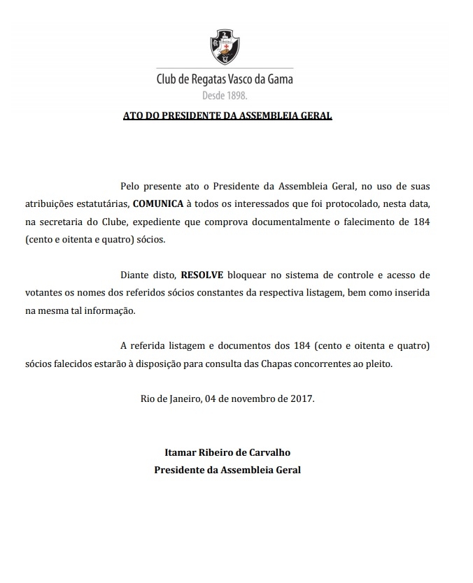 Presidente da Assembleia Geral comunica a retirada de 184 sócios falecidos da lista de votantes