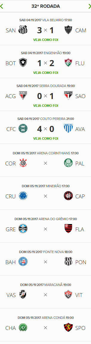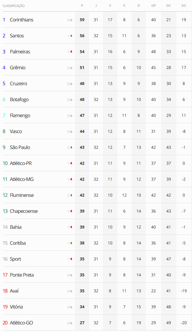 O Vasco, que enfrenta o Vitória neste domingo às 19h no Maracanã, segue na 8ª colocação do Campeonato Brasileiro após os jogos deste sábado. O Atlético-MG, que poderia ultrapassar o Gigante da Colina na tabela de classificação, perdeu para o Santos por 3 a 1.