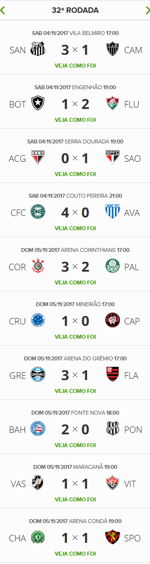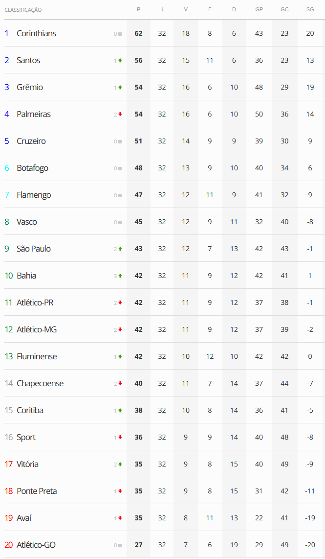 Terminada a 32ª rodada do Brasileiro, o Vasco, que empatou com o Vitória por 1 a 1, segue na 8ª posição na tabela de classificação.