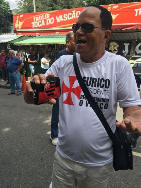 Possível eleitor mostra apoio a Eurico na camisa, mas ri ao mostrar carteira do Flamengo. Ele está aqui em São Januário.