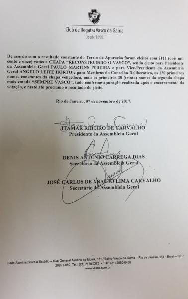 Confira abaixo o Termo de Apuração da eleição vascaína: