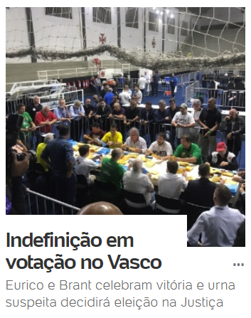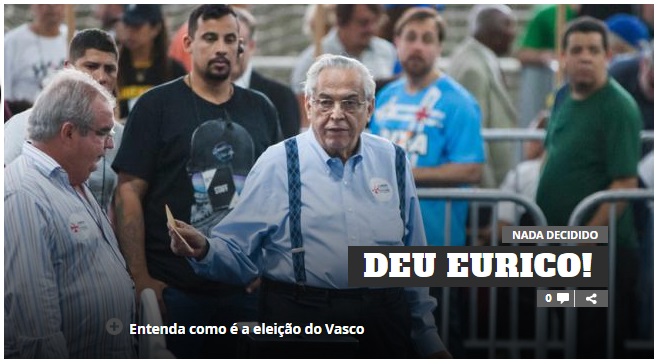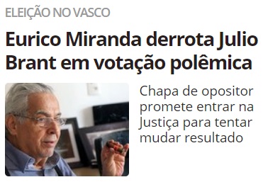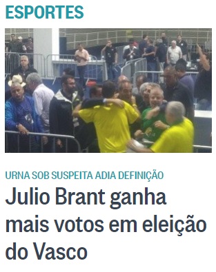 As versões online dos jornais cariocas e os principais portais de notícias ficaram divididos na hora de anunciar o resultado das eleições para o Conselho Deliberativo do Vasco, realizadas na última 3ª-feira, dia 7 de novembro. Alguns veículos cravaram vitória de Eurico Miranda, que obteve mais votos somando-se todas as urnas, enquanto outros decidiram destacar a votação de Julio Brant, que somou mais votos ao não se considerar a urna 7, que está sub judice. Veja abaixo.