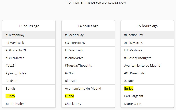 As eleições para o Conselho Deliberativo do Vasco, realizadas na última 3ª-feira, dia 7 de novembro, fizeram com que Eurico Miranda, atual presidente do clube e candidato à reeleição, ocupasse os trending topics mundiais do Twitter. Já no Brasil, o presidente vascaíno chegou a liderar os trending topics por algumas horas, seja com seu nome, seja por meio da hashtag #ForaEurico.