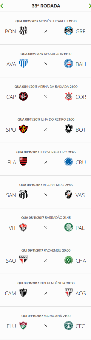 Restam apenas 6 jogos para o fim do Campeonato Brasileiro 2017. Nesta quarta e quinta-feira serão disputadas as partidas da 33ª rodada. O Vasco enfrentará o Santos na Vila Belmiro nesta quarta-feira às 21h45. O jogo terá transmissão da TV Globo para o Rio de Janeiro e parte da rede.