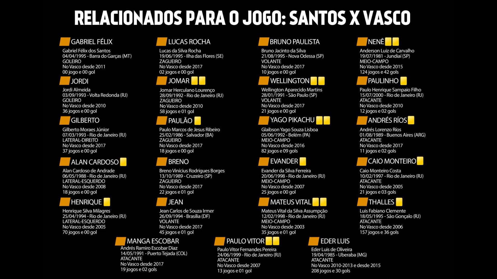 O Vasco divulgou hoje os relacionados para a partida de logo mais, às 21h45, contra o Santos, na Vila Belmiro. O jogo, que terá transmissão pela TV Globo para o Rio de Janeiro e parte da rede, é válido pela 33ª rodada do Campeonato Brasileiro.