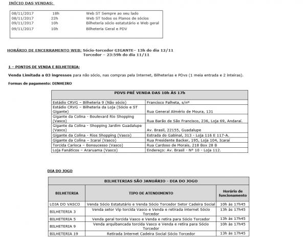 1. SÓCIO TORCEDOR GIGANTE – a venda de ingressos para os sócios-torcedores será feita exclusivamente pela FutebolCard ATRAVÉS DO SITE DO GIGANTE E NA BILHETERIA AO LADO DA MEGALOJA DE SÃO JANUÁRIO.