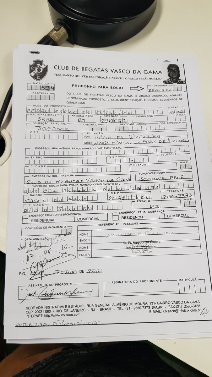 Novamente a do Edmundo distribuída pelo Vasco aos jornalistas nesta noite. Tapamos o CPF e o RG #lanceVAS