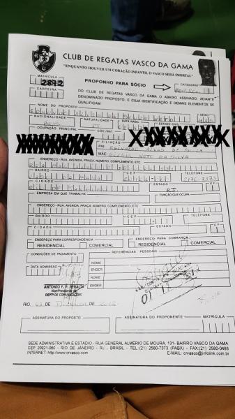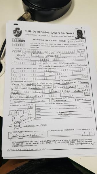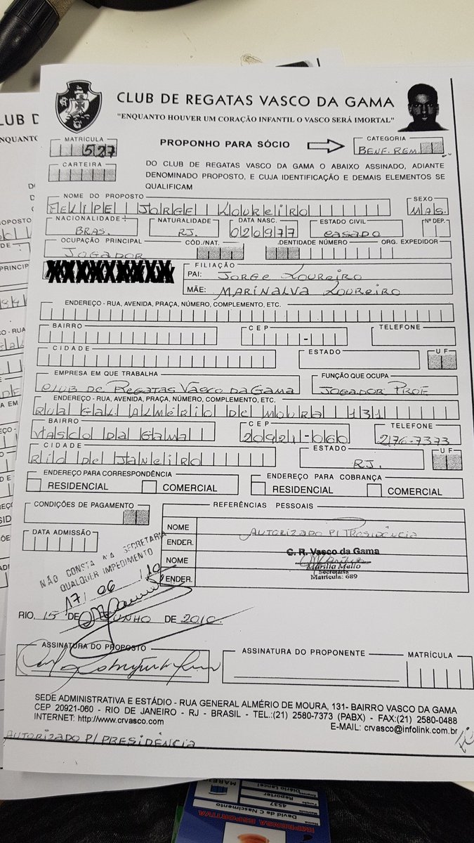 Novamente a ficha distribuída pelo Vasco à imprensa do Felipe. Tapamos o CPF. Endereço e telefone são do Vasco #lanceVAS