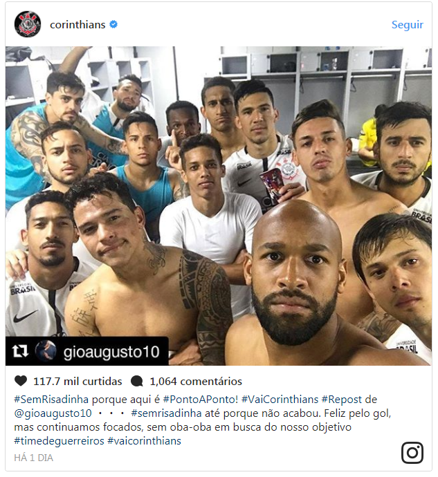 Braços cruzados, cara fechada e sem sorriso. A pose dos jogadores do Corinthians em foto tirada no vestiário após a vitória sobre o Atlético-PR pode mostrar seriedade para as rodadas finais do campeonato, que podem confirmar o título brasileiro em 2017.