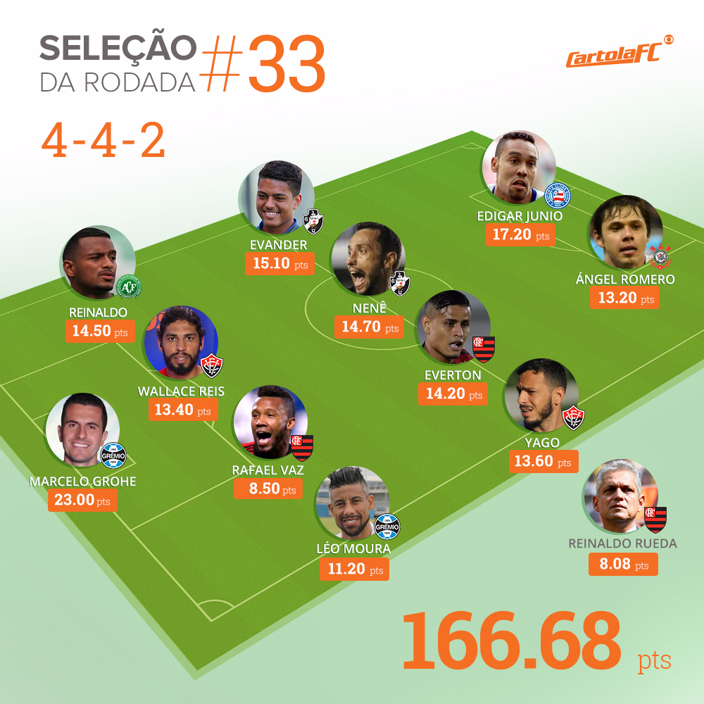 O Flamengo estabeleceu um domínio na seleção da rodada #33 do Cartola FC com Rafael Vaz, Everton e o técnico Marcelo Rueda. No entanto, a mitagem ficou por conta do goleiro Marcelo Grohe, do Grêmio, e seus 23 pontos. O time gaúcho também foi representado por Léo Moura. Outros clubes que colocaram dois jogadores foram Vasco, com os meias Evander e Nenê, e Vitória, com Wallace Reis e Yago. O pior da rodada foi Fernando Bob, da Ponte Preta, com -5.50.