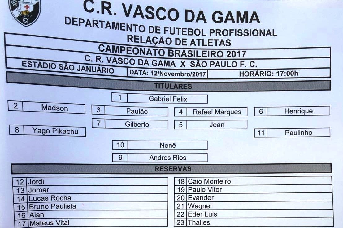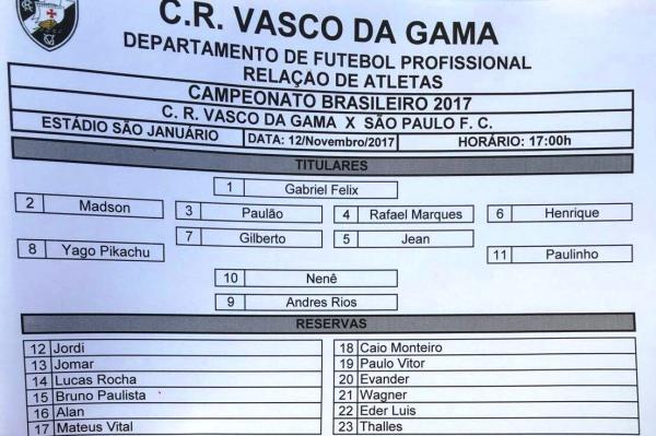 Confira a escalação do Vasco: