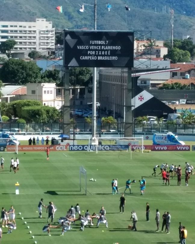 Telão informa que Vasco foi campeão brasileiro de Futebol 7 ao vencer o Flamengo por 2 a 0. Torcida vibra. #trcolina