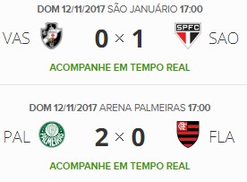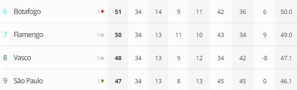 Com os resultados parciais de Vasco x São Paulo e Palmeiras x Flamengo, o Vasco segue a 2 pontos do G7.