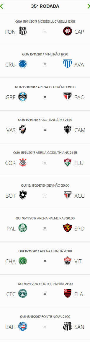 Restam apenas 4 jogos para o fim do Campeonato Brasileiro 2017. Nesta quarta e quinta-feira serão disputadas as partidas da 35ª rodada. O Vasco enfrentará o Atlético-MG em São Januário nesta quarta às 21h45. O jogo terá transmissão da TV Globo, mas não para o Rio de Janeiro.