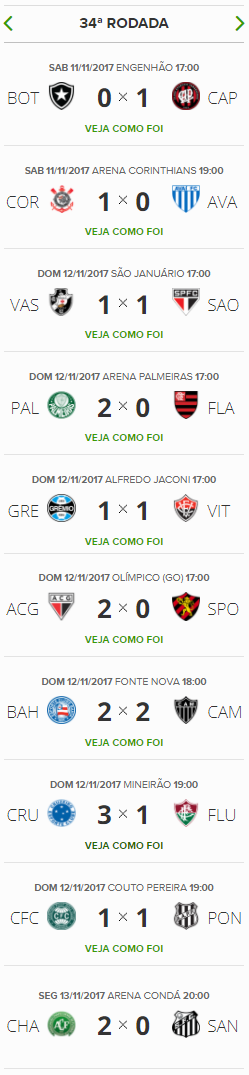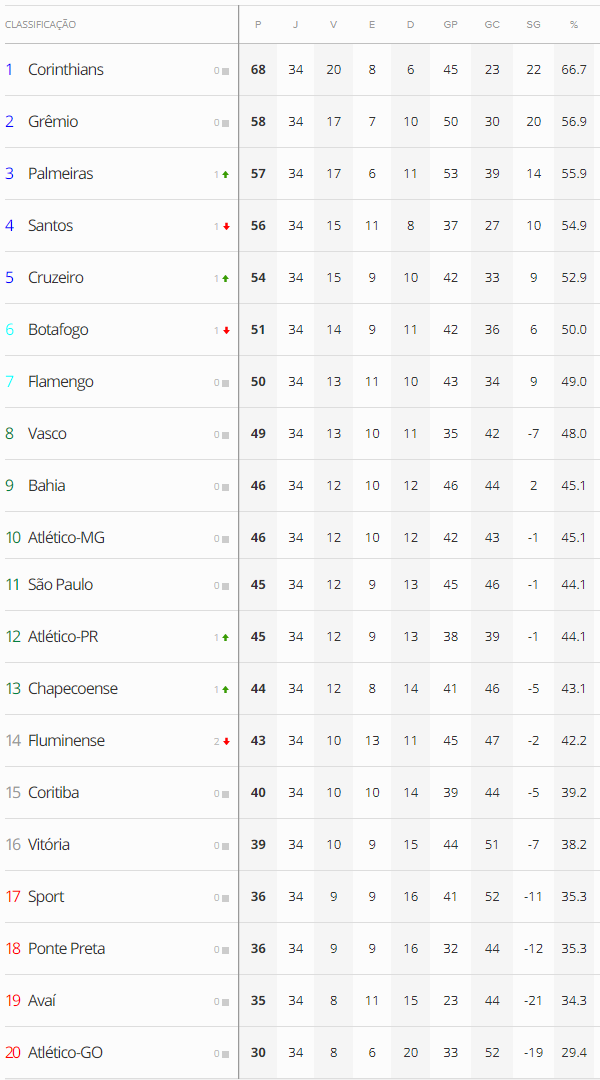 Terminada a 34ª rodada do Brasileiro, o Vasco, que empatou com o São Paulo 1 a 1, segue na 8ª posição na tabela de classificação.