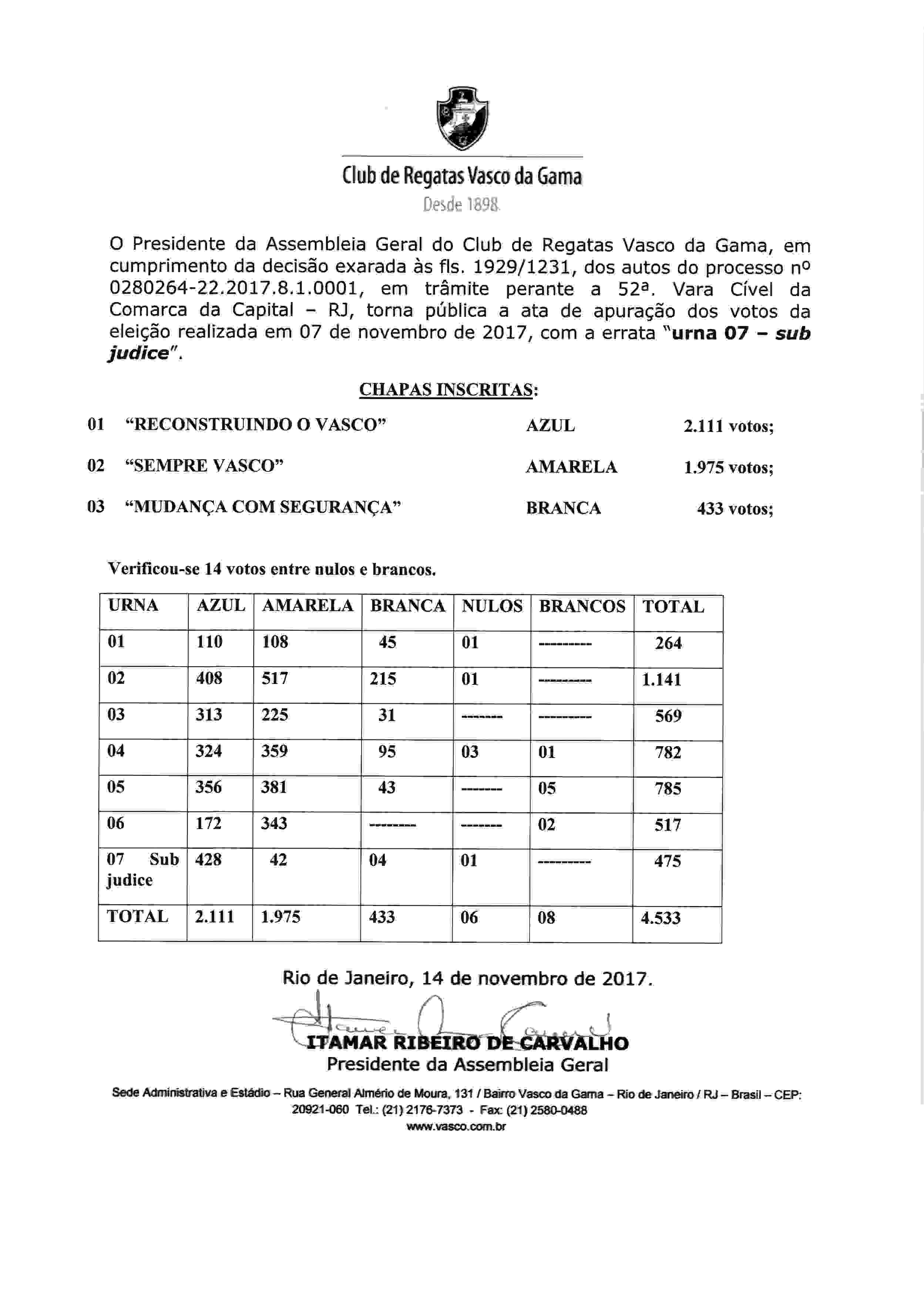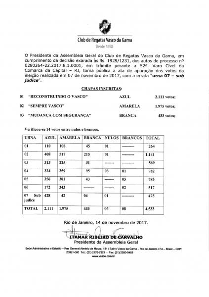 Vasco divulga resultado das eleições com observação de que a urna 7 está sub judice