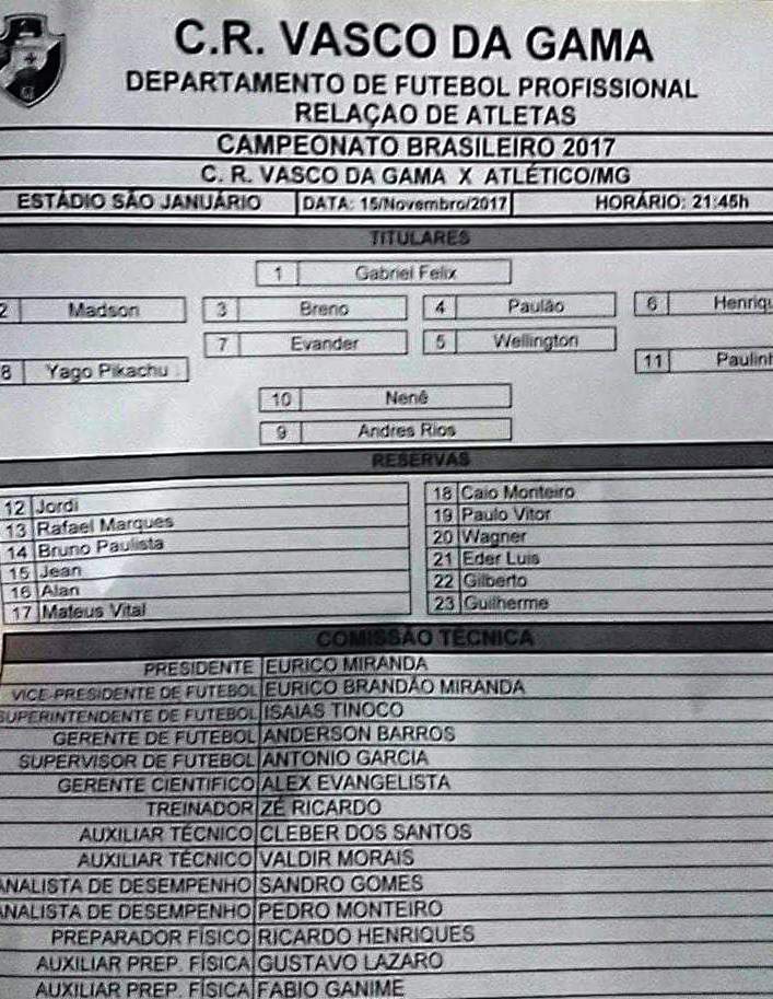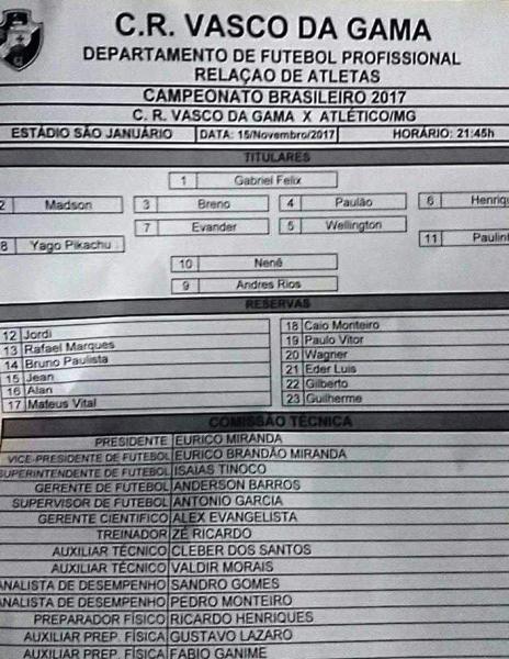 O Vasco enfrenta o Atlético-MG nesta quarta-feira novamente com Gabriel Felix como goleiro titular. Martín Silva está com a Seleção do Uruguai e volta ao Gigante da Colina na próxima rodada. A novidade no time titular é a entrada de Evander no lugar de Jean.