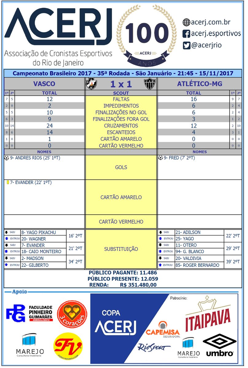 16/11/17 - São Januário recebeu 12.059 torcedores para Vasco x Atlético-MG, sendo 11.486 pagantes