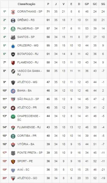 Com o empate diante do Atlético-MG, o Vasco perdeu a chance de, ainda que provisoriamente, entrar no G7. Por outro lado, o Gigante da Colina não terminará a rodada abaixo da oitava colocação. Isso é conveniente porque, se o Grêmio conquistar a Libertadores 2017 e o Cruzeiro terminar o campeonato no G6, o 8º colocado também irá à Libertadores 2018. Veja a classificação do Brasileiro faltando cinco jogos para o fim da 35ª rodada:
