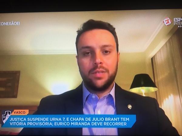 O candidato de oposição à presidência do Vasco, Julio Brant, participa neste momento do programa "Conexão EI", do canal Esporte Interativo. Nesta quinta-feira, a juíza Maria Cecília Pinto Gonçalves, da 52ª Vara Cívil do Rio de Janeiro, despachou uma liminar em que desconsiderou a urna 7 da eleição do Vasco. Com isto, momentaneamente Julio Brant é o vencedor do pleito com Eurico Miranda em segundo lugar.