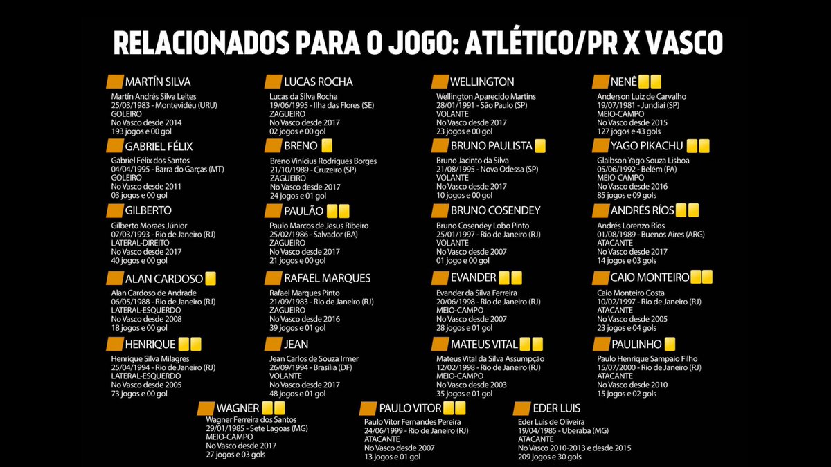 18/11/17 - Confira os relacionados do Vasco para o jogo deste domingo contra o Atlético-PR