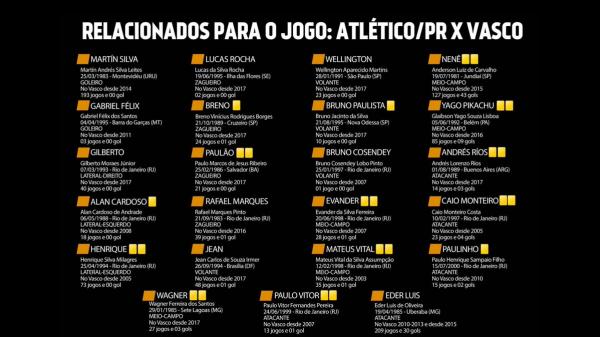 19/11/17 - Confira os desfalques e pendurados de Atlético-PR e Vasco para o jogo deste domingo