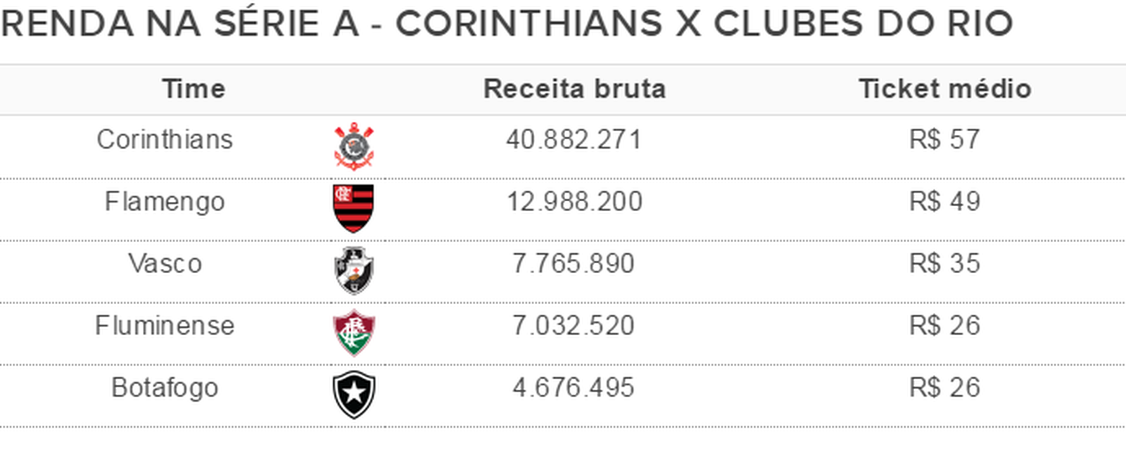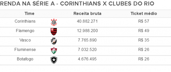 Para se ter uma ideia, o clube do Parque São Jorge teve R$ 8,4 milhões a mais que os quatro grandes do futebol carioca somados (R$ 32,4 milhões). Enquanto o Flamengo embolsou R$ 12,9 milhões, mesmo tendo o terceiro mais alto valor médio dos ingressos (R$ 49), o Vasco acumulou R$ 7,7 milhões.