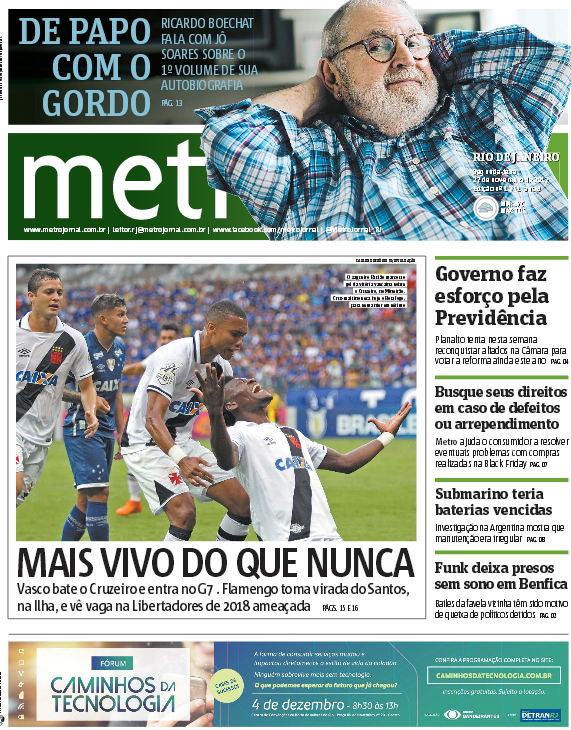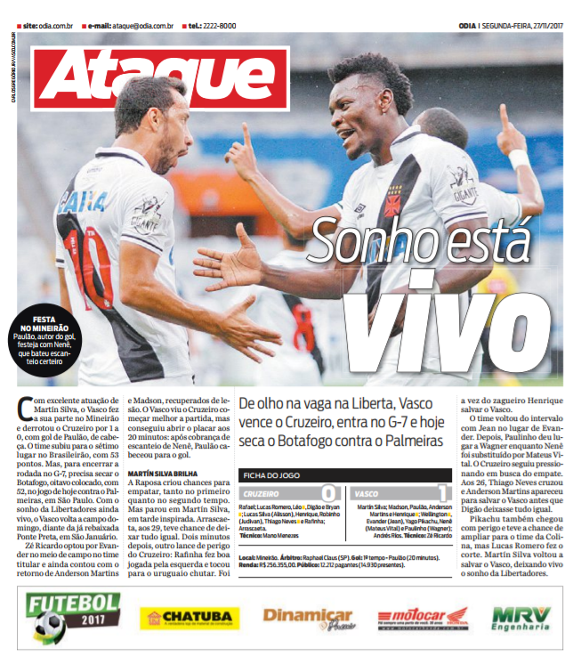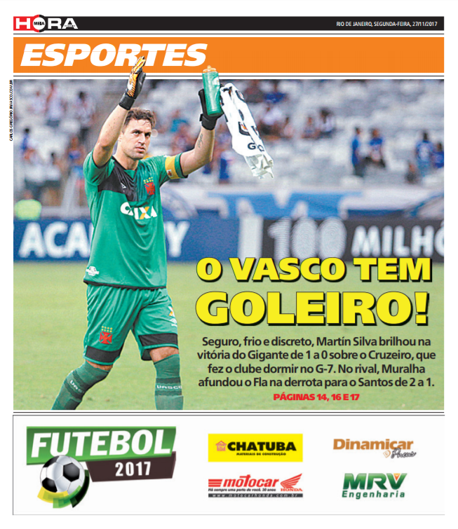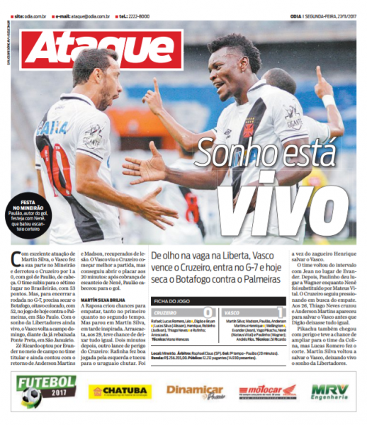 Veja como a imprensa carioca destacou a vitória do Vasco sobre o Cruzeiro por 1 a 0 no último domingo, no Mineirão, pelo Brasileiro, que deixou o Vasco mais perto da classificação para a Libertadores: