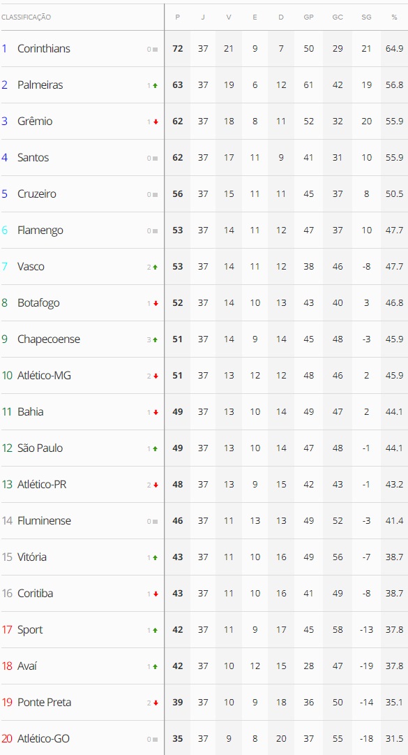 Terminada a 37ª rodada do Brasileiro, o Vasco, que derrotou o Cruzeiro por 1 a 0, subiu da 9ª para a 7ª posição na tabela de classificação, entrando, portanto, no G7.