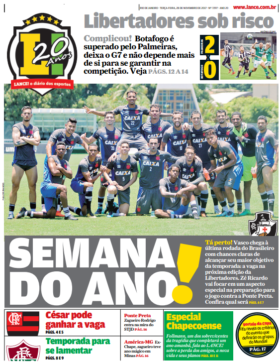 O Vasco é o destaque da capa do jornal "Lance" desta terça-feira no Rio de Janeiro. O Gigante da Colina enfrentará a rebaixada Ponte Preta neste domingo, precisando da vitória para se classificar para a Libertadores 2018.