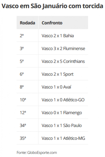 Nos quatro jogos em que foi obrigado a jogar fora de São Januário como mandante, o Vasco não venceu. Empatou com o Santos, no Engenhão, perdeu para Atlético-PR e Cruzeiro em Volta Redonda e, também no estádio da Cidadania, empatou com o Palmeiras.