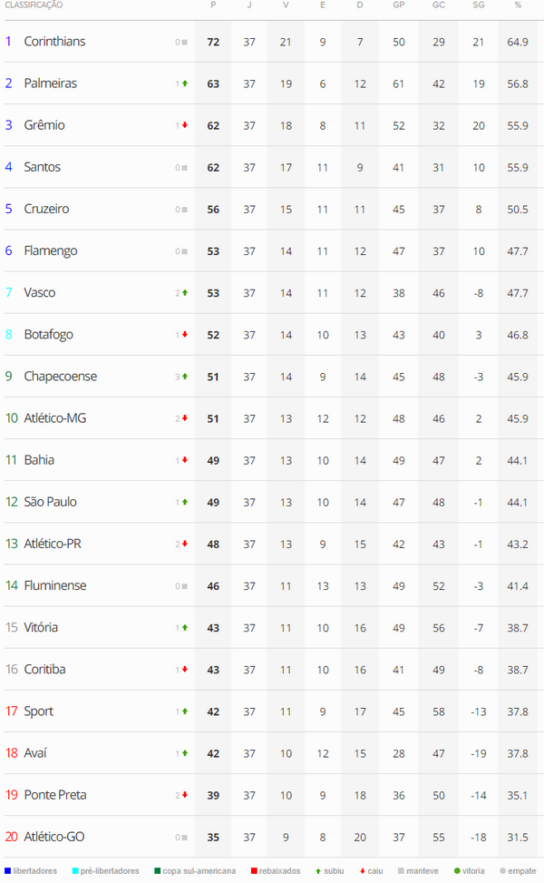 Confira a classificação do Brasileiro já considerando 8 clubes com vaga na Libertadores 2018