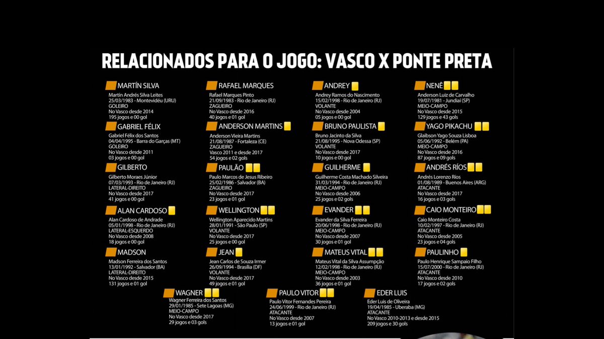 03/12/17 - Confira os relacionados do Vasco para o jogo deste domingo contra a Ponte Preta