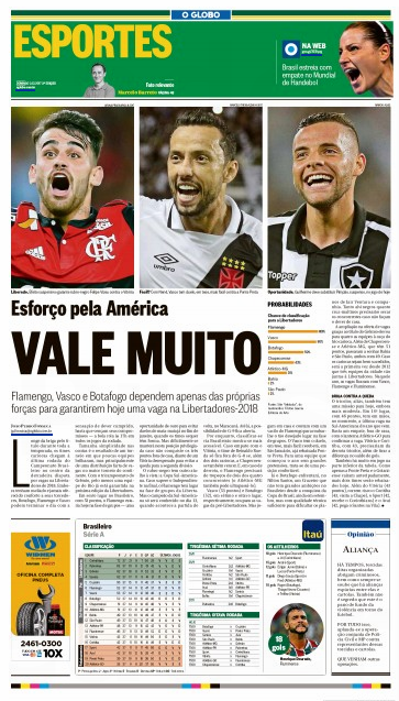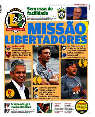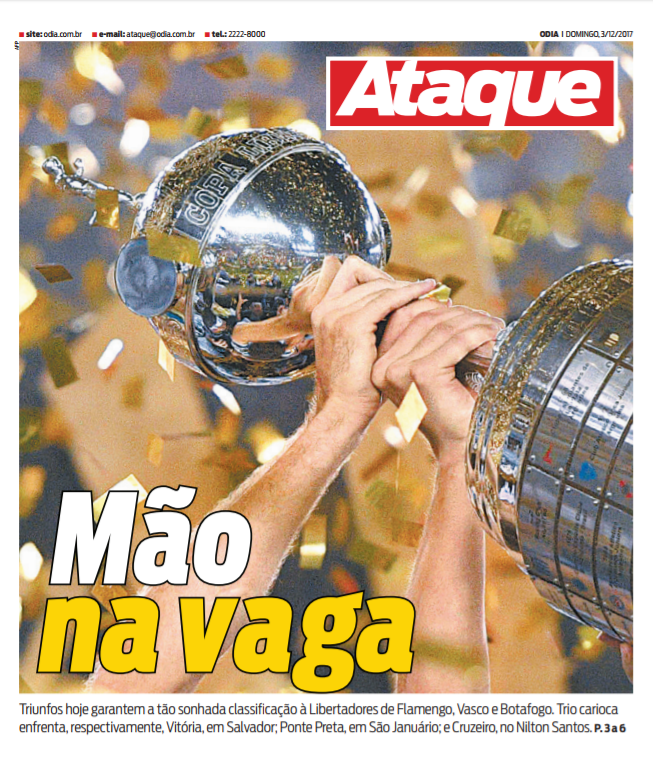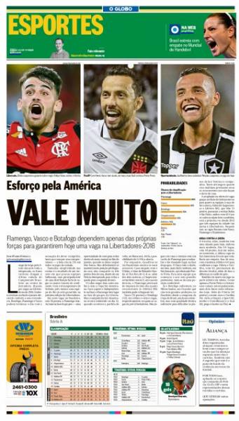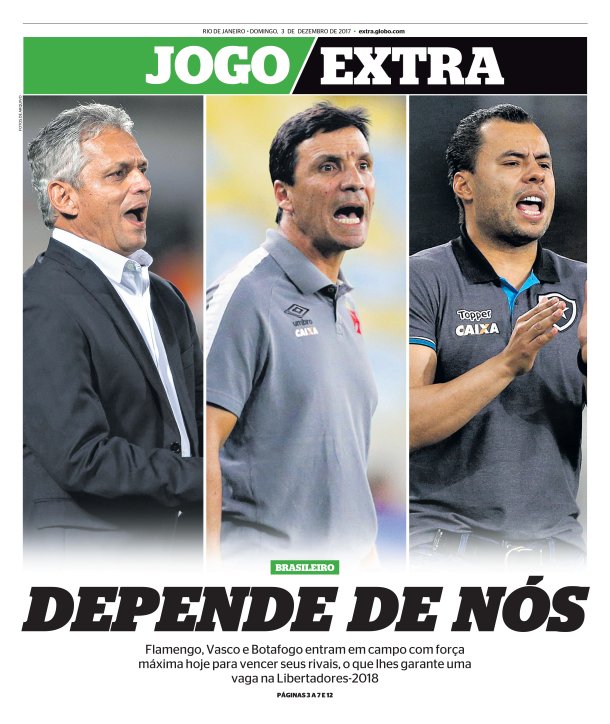 Três clubes cariocas - Vasco, Flamengo e Botafogo - brigam pela vaga na Libertadores na 38ª e última rodada do Campeonato Brasileiro, que acontece neste domingo. Veja abaixo como a imprensa do Rio de Janeiro destacou a rodada decisiva.