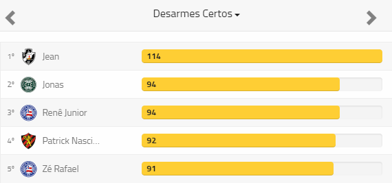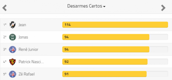 O vascaíno Jean terminou o Campeonato Brasileiro 2017 como maior ladrão de bolas da competição. Foram 114 desarmes, nada menos do que 20 a mais do que os segundo colocados, Jonas, do Coritiba, e Renê Júnior, do Bahia. Os números são do Footstats, site especializado em estatísticas de futebol.
