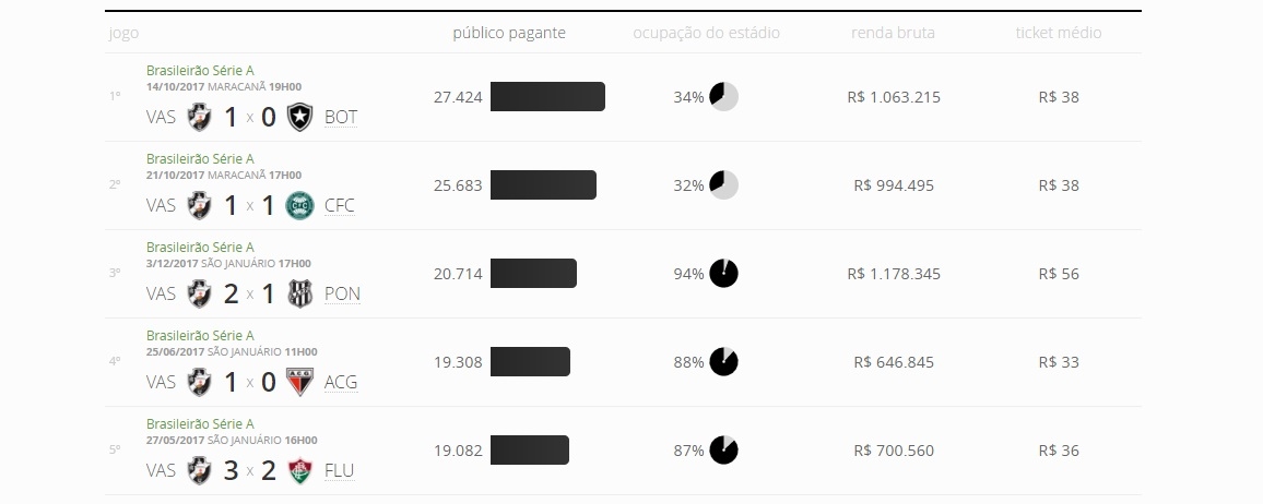 Certamente a média do Gigante da Colina seria ainda maior se o clube não tivesse sido obrigado a atuar longe de São Januário por conta dos inúmeros problemas que precisou superar ao longo da caminhada no Brasileirão. O Cruzmaltino jogou três partidas com portões fechados (Santos, Grêmio e Chapecoense) e outras três em Volta Redonda (Atlético Paranaense, Cruzeiro e Palmeiras), onde teve uma média de cinco mil torcedores.
