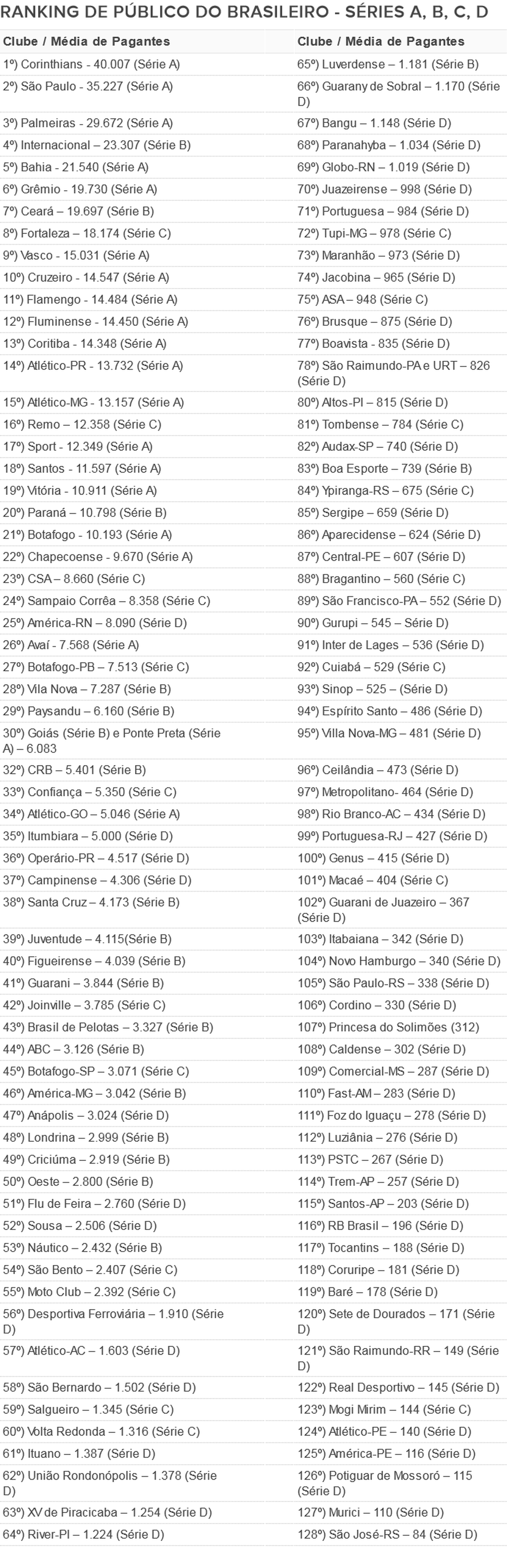 Na sequência aparece o São Paulo (35.227), que mesmo não lutando diretamente pelas primeiras posições, teve os três maiores públicos levando-se em conta as quatro divisões do Brasileirão - São Paulo 1 x 1 Corinthians (61.142), São Paulo 1 x 1 Bahia (60.485) e São Paulo 3 x 2 Cruzeiro (56.052). Presença que foi fundamental para o time do Morumbi escapar do rebaixamento. Lembrando que o clássico Majestoso e o duelo contra o Tricolor baiano também são os dois maiores públicos do país na temporada juntando todas as competições. Confira todos os públicos e rendas dos principais campeonatos envolvendo clubes brasileiros.
