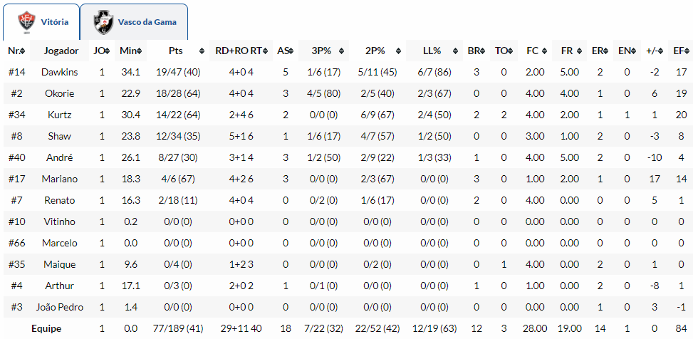 Um confronto de tirar o fôlego. Vitória e Vasco da Gama fizeram um duelo muito equilibrado na noite desta quinta-feira no Ginásio Poliesportivo de Cajazeiras, em Salvador, na Bahia. E, no fim das contas, liderado pelo americano Kenny Dawkins, o Leão saiu vitorioso pelo apertado placar de 77 a 75. Essa é apenas a segunda vitória da equipe baiana que, na rodada passada, desbancou outro carioca, o Botafogo. Já o Cruz-Maltino, com um time recheado de estrelas, perdeu pela quinta vez no campeonato, sendo a terceira seguida (antes caiu para Basquete Cearense e Mogi das Cruzes).