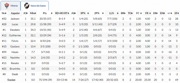 O cestinha do jogo foi David Jackson, do Vasco da Gama, com 20 pontos. Ele conseguiu nove rebotes e cinco assistências também. Ainda pelo Cruz-Maltino, foram bem: Lucas Mariano (15 pontos e nove rebotes); Gui Deodato (14 pontos e nove rebotes); e Guilherme Giovannoni (10 pontos e seis rebotes). Do Vitória, vale destacar Dawkins (19 pontos, quatro rebotes e cinco assistências); Okorie (18 pontos, quatro rebotes e três assistências); Kurtz (14 pontos, seis rebotes e duas assistências); e Shaw (12 pontos e seis rebotes).