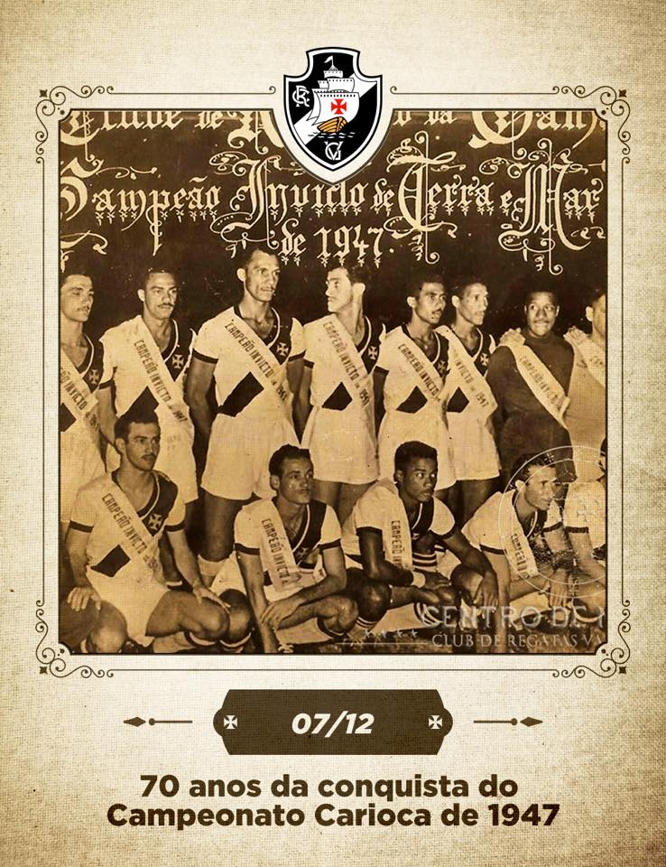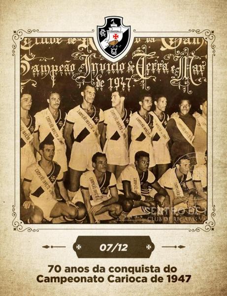 Hoje comemoramos 70 anos de um dos vários títulos obtidos pelo "Expresso da Vitória". No dia 07 de dezembro de 1947, o Vasco empatou com o Botafogo em 0 a 0 em São Januário e conquistou o Campeonato Carioca com duas rodadas de antecedência. Naquela época, o torneio era disputado no formato de pontos corridos, em turno e returno.