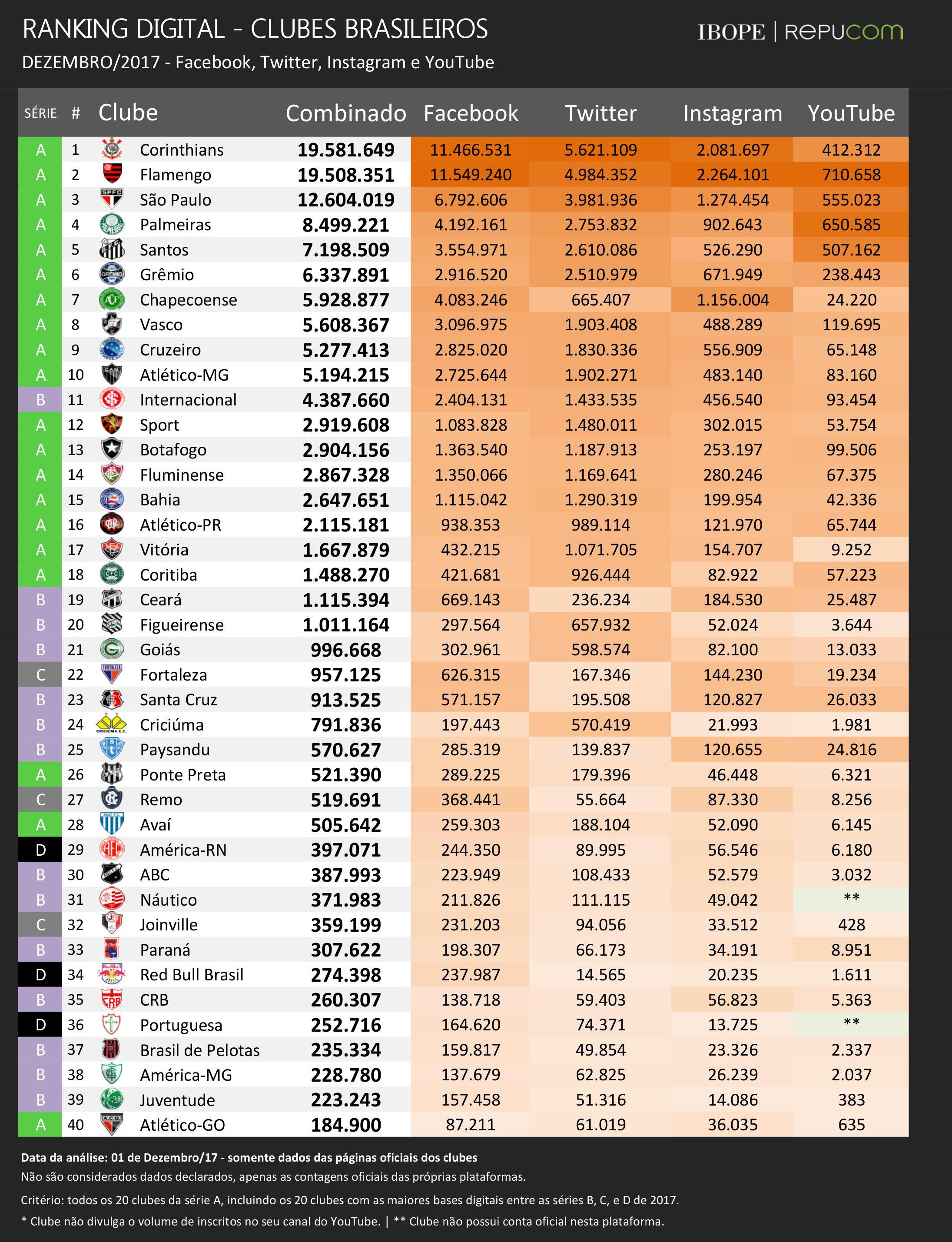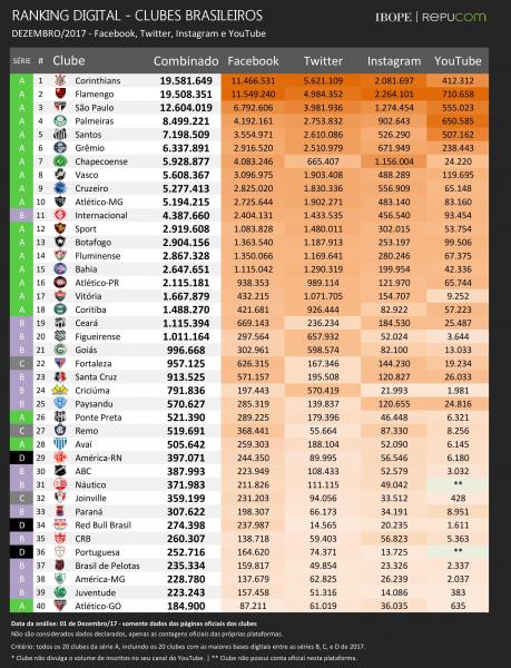 Com a diminuição no ritmo de crescimento do Flamengo e com um expressivo crescimento de seguidores após a conquista do campeonato brasileiro, o Sport Club Corinthians Paulista retomou a liderança do ranking digital de clubes. O clube paulista havia perdido a liderança no final de setembro, enquanto os rubro-negros disputavam a final da Copa do Brasil. Com a confirmação do heptacampeonato, o clube paulista somou mais de 316 mil novas inscrições e abriu vantagem de mais de 70 mil para o Flamengo.