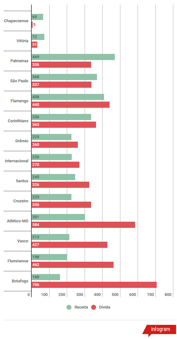 É difícil chegar a valores exatos e atuais porque os próprios clubes ainda não fecharam o balanço do ano. Por isso, vamos utilizar os dados oficiais levantados pelo Itaú BBA em 2016. Esta é a última temporada com valores oficiais e é possível assumir que a relação entre receita e dívida não muda assim tão facilmente de um ano para outro.