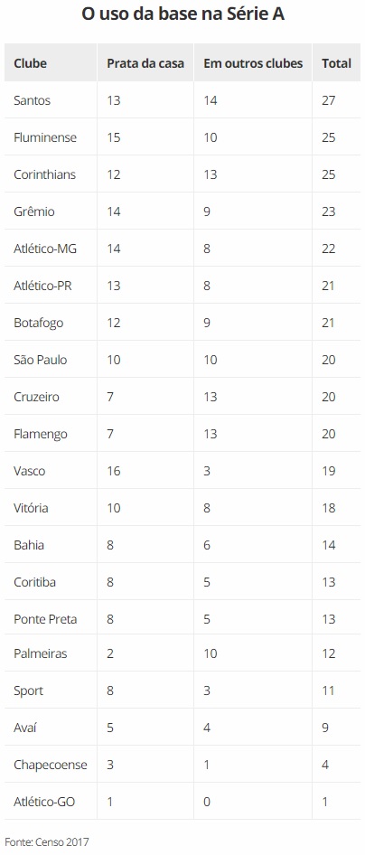 Assim como em 2014 e 2015, o Santos é novamente o clube que revelou mais jogadores para a Série A do Brasileirão, conforme o Censo levantado pelo blog até a 34ª da competição. Ao todo, 27 dos 672 jogadores que entraram em campo no torneio estrearam profissionalmente pelo Peixe ou eram vinculados ao clube no momento em que entraram em campo pela primeira vez em um jogo de adultos, critério este adotado para definir o clube que revelou o jogador (e aí há uma diferença entre revelar e formar).