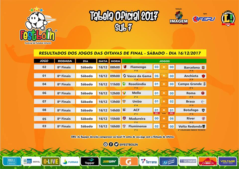 Segue a ''Resultados Finais'' do Festbolin 2017'' na categoria Sub-7 nas ''Oitavas de Final'' realizada neste sábado dia 16/12.
