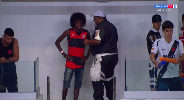Torcedor do Flamengo tenta acompanhar o clássico com a camisa do Rubronegro, mas é impedido por PM.