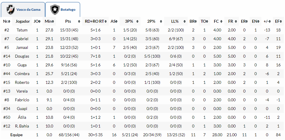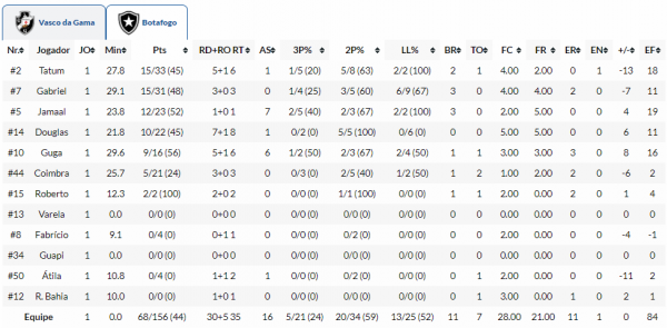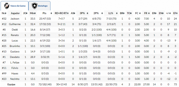 Vasco e Botafogo chegaram para o duelo desta terça-feira com campanhas idênticas. Com apenas uma vitória em seis jogos, os times ocupavam as duas últimas posições da tabela ao início da rodada. O "clássico dos desesperados" teve de tudo. Rubro-negro na arquibancada da Arena Carioca 1, muitos erros de ataque, tensão, viradas no placar e uma atuação de gala de David Jackson. Com 25 pontos e cinco assistências, o americano conduziu o Vasco à vitória por 72 a 68. Com o triunfo, o Cruz-maltino saltou da 14ª para a 11ª posição. O Botafogo segue afundado na lanterna.