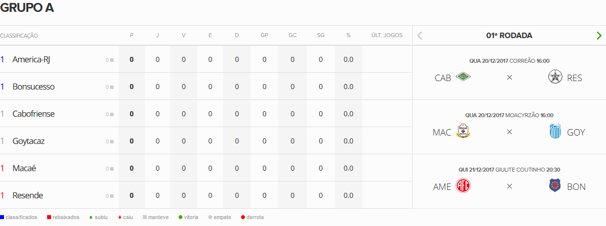A primeira fase do Campeonato Estadual 2018 começa nesta quarta-feira e abre com uma seletiva entre America e Goytacaz (que subiram da Série B) e Resende, Macaé, Cabofriense e Bonsucesso (os quatro piores do Estadual de 2017). Os dois primeiros jogarão a Taça Guanabara e a Taça Rio, enquanto os dois últimos dessa seletiva serão rebaixados. Confira abaixo: