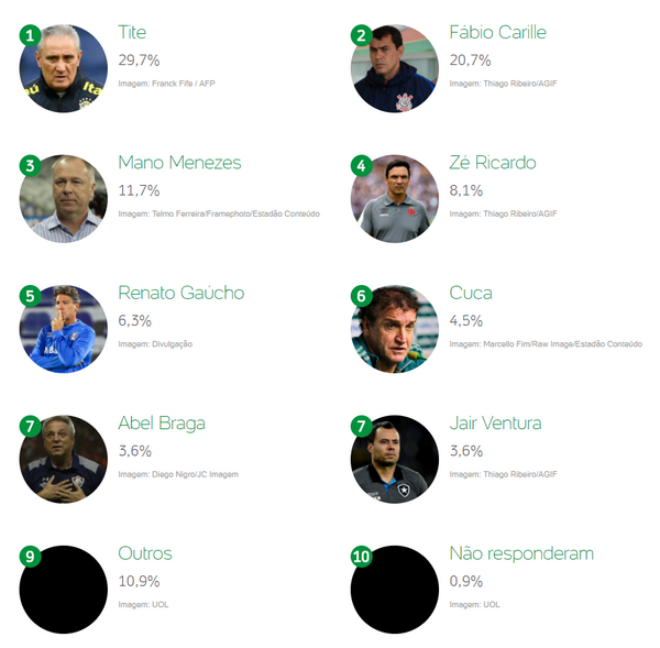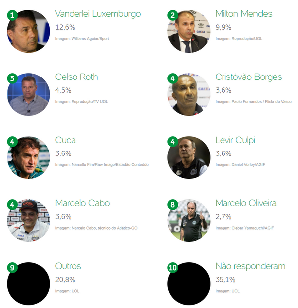 Entre os piores, a escolha da maioria ficou com Vanderlei Luxemburgo, que não deu certo à frente do Sport ao longo de 2017. O veterano teve 12,6% dos votos. Em seguida apareceram Milton Mendes (9,9%) e Celso Roth (4,5%).