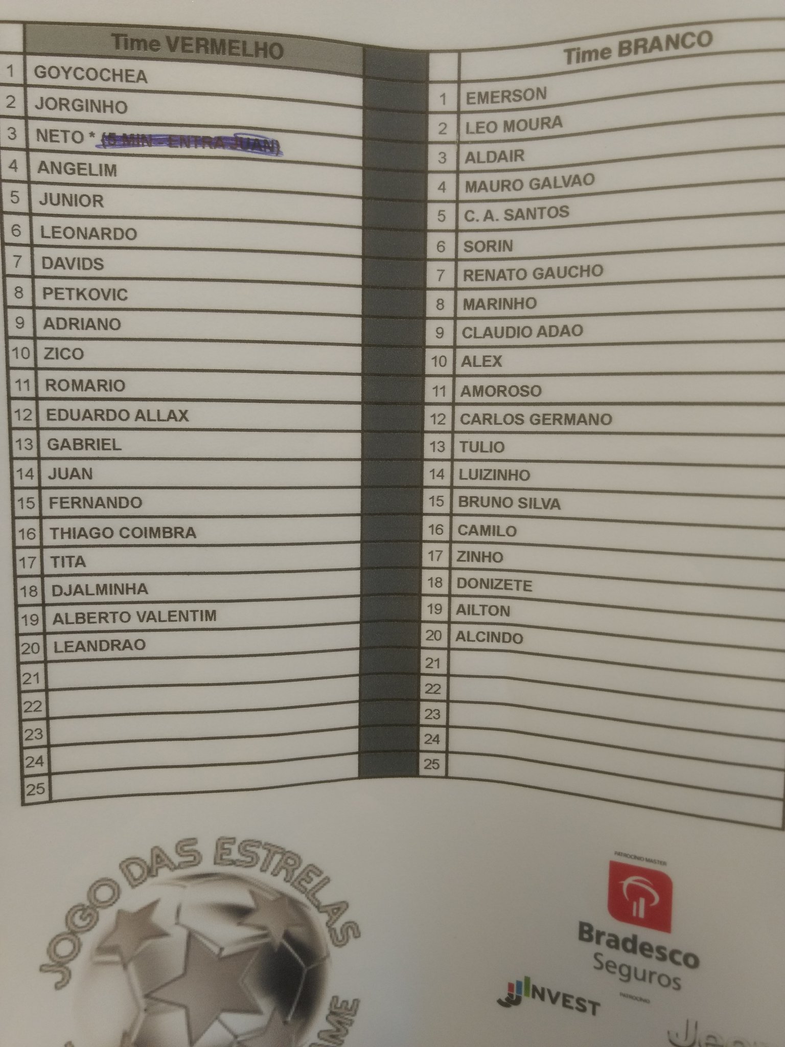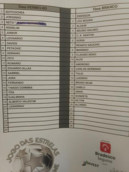 O "Jogo das Estrelas", partida beneficente organizada pelo ex-jogador Zico, acontece neste momento no Maracanã. Entre os participantes estão alguns ex-jogadores do Vasco: Carlos Germano, Mauro Galvão, Donizete, Romário, Jorginho, Tita, Petkovic, Léo Moura e Leandrão. O Sportv transmite ao vivo. Clique