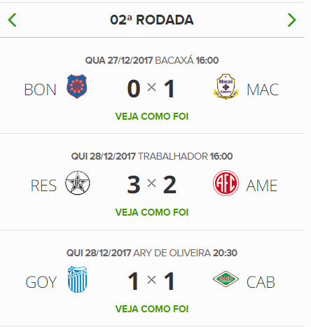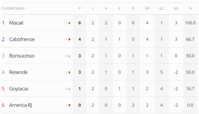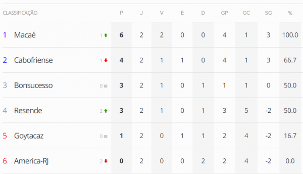 Após duas rodadas da primeira fase do Estadual 2018, o Macaé lidera com seis pontos, seguido pela Cabofriense, que tem quatro. O América, que ainda não pontuou, está na lanterna.
